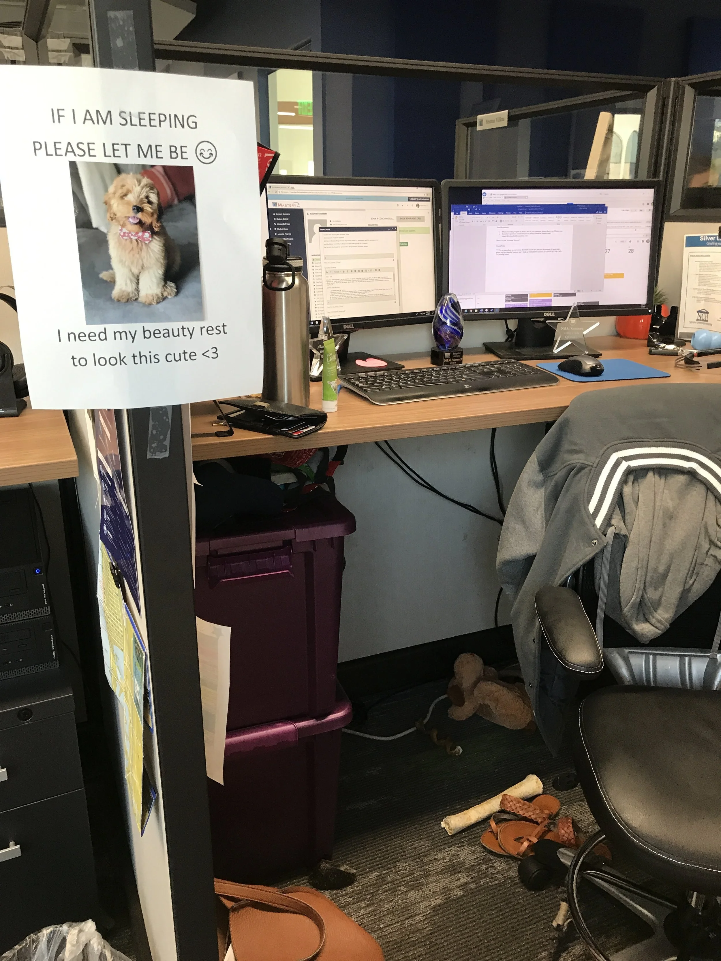 Wrong! Your dog might be totally fine, but people are not. People are the problem (in a greatest possible way). People love puppies. People love teddy bear puppies. Imagine having one in your office! You’d probably do a “sneak by” 36 times in one hour! I know I would. I eventually had to put up a sign that said, “If I’m sleeping, please let me be. I need my beauty rest to look this cute.” just so people wouldn’t wake him up. While Pax was at the office sleeping peacefully under my desk, I would be on coaching calls and taking finals in graduate school. I absolutely loved having my buddy with me all the time and he was just so great in the office. It took time for him to understand what happened there but after a short while he got it and just slept under my desk most days. Below are the most important things to think about when preparing to take your dog to work with you.